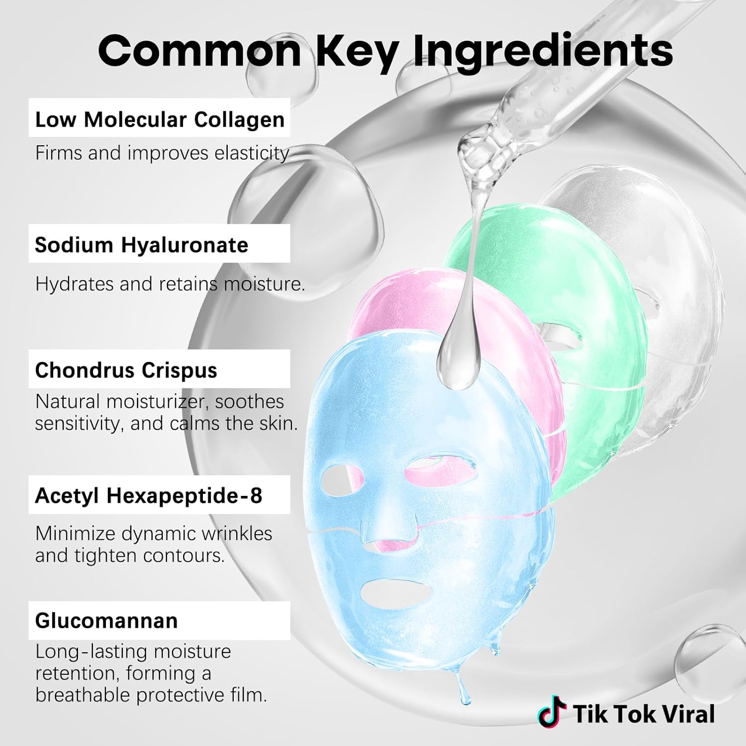 - Elasticity & Glow in One Mask—This hydrogel face mask is made of breathable gel material,which can be gently pressed to closely fit the skin's contours. It turns transparent over 1-3 hours (varies by skin type),releasing active ingredients deep into the skin.The overnight face mask stays securely in place all night—no slipping or sliding,wake up to glass skin