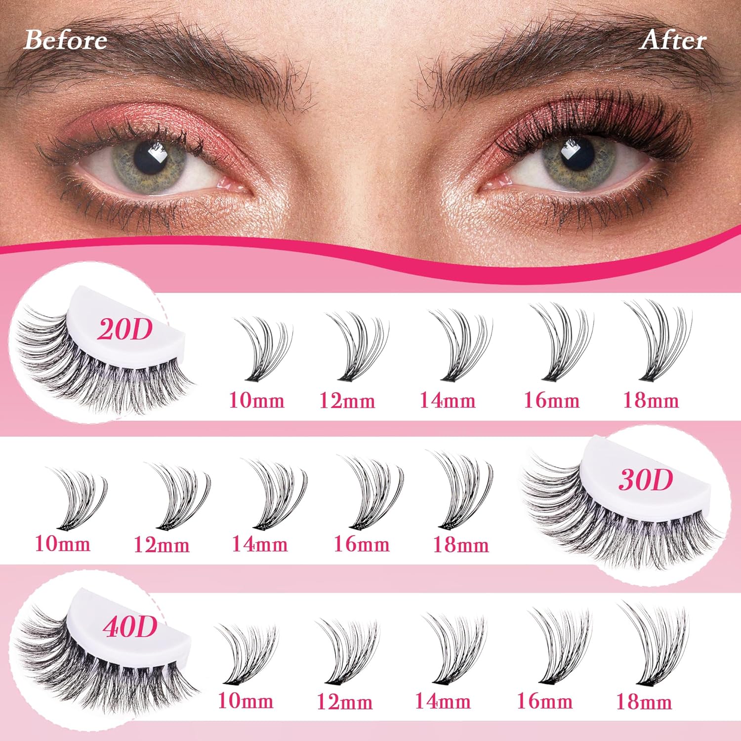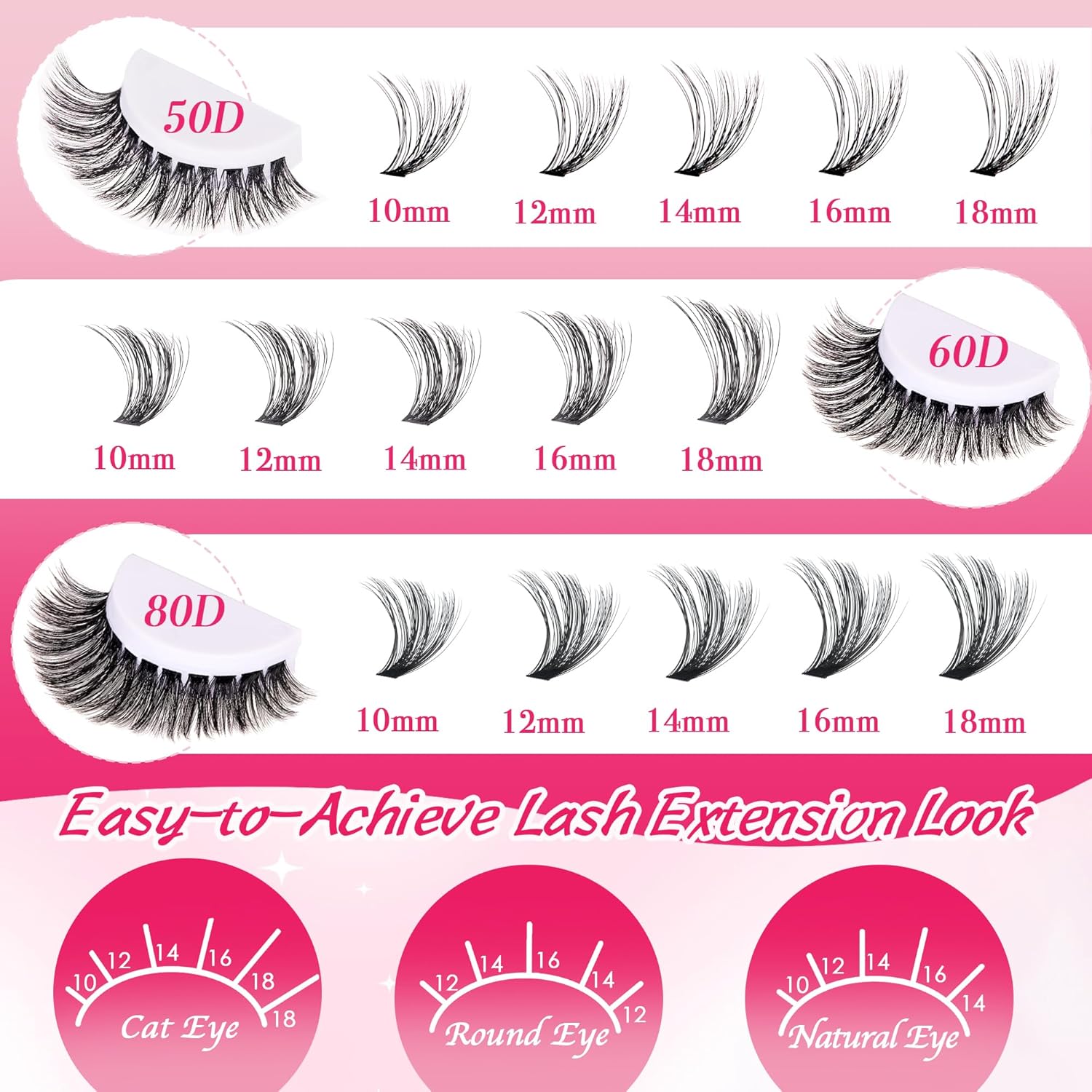- Easy-to-Achieve Lash Extension Look:You can use different lengths of eyelash clusters to create more style possibilities - cat-eye, fan-eye, doll-eye, dramatic-eye, natural, fluffy, and more.