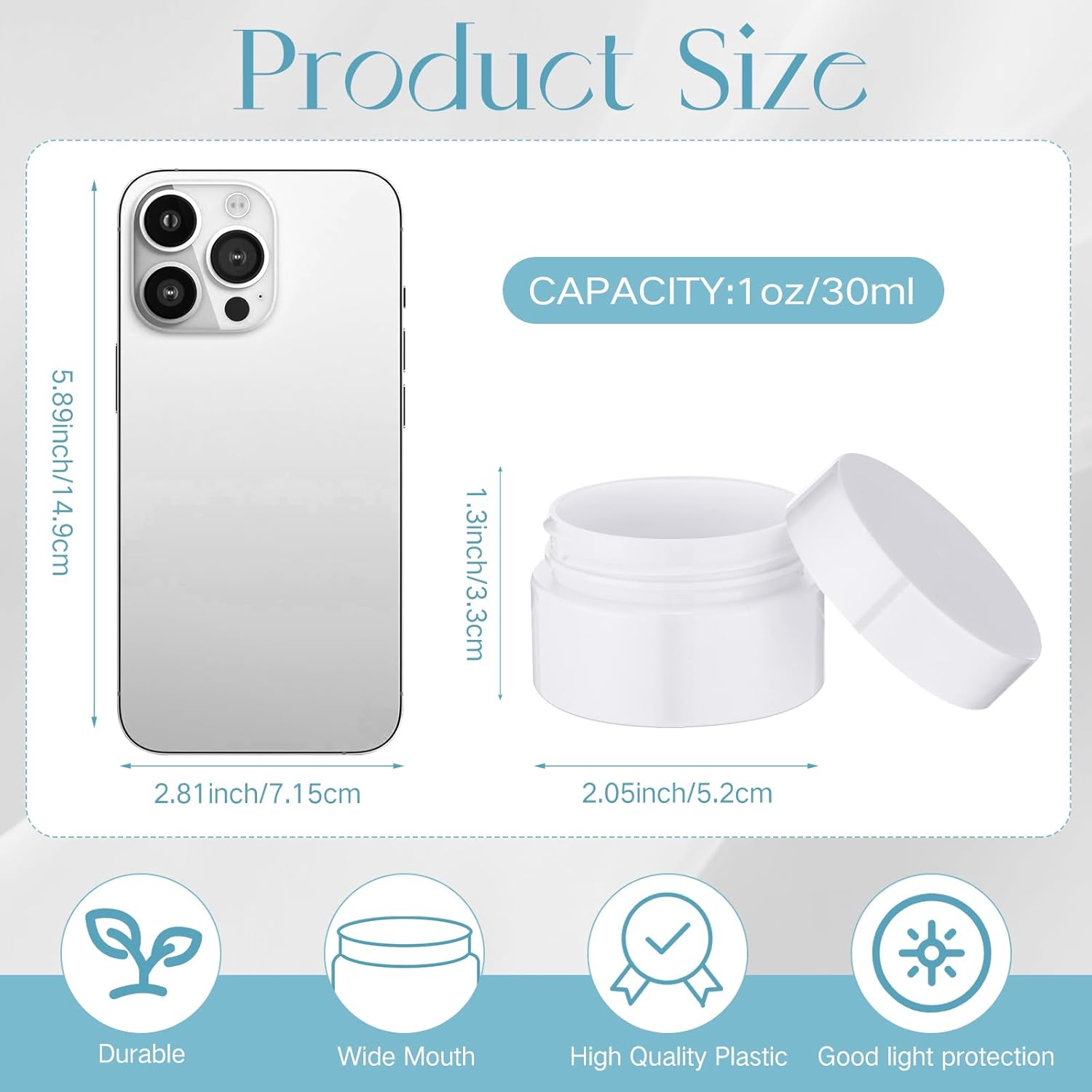 - What You Receive: there are 4 pieces plastic jars with white screw-on lids; They are durable and refillable, measuring about 5.2 cm/ 2.05 inches in diameter, 3.3 cm/ 1.3 inches in height