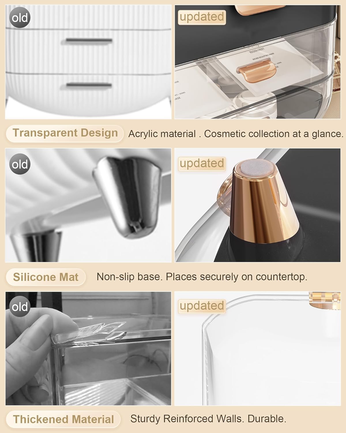 - 🎁【Thickened Material & Non-slip】Reinforced and upgraded handle won't fall off. Easily move the skin care organizer to anywhere. The countertop organizer is made of thickened ABS material, which is stronger and more durable than normal ones. Drawer and clear top are able to open and close easily. Rubberized bottom, non-slip and won't scratch desktop.