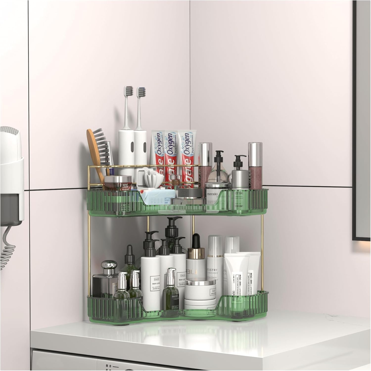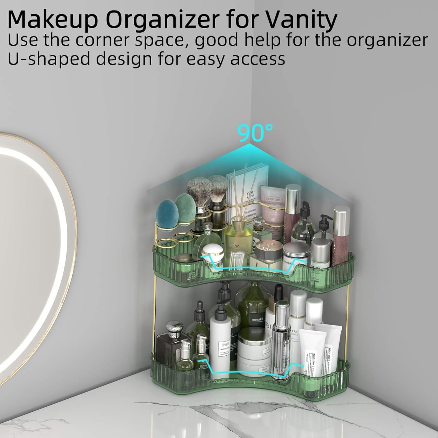 2 Tier Corner Bathroom Organizer Countertop, Vanity Makeup Organizer with Brush Holder, Space-Saving Skincare Storage Corner Shelf for Bathroom, Dressing Table, Kitchen