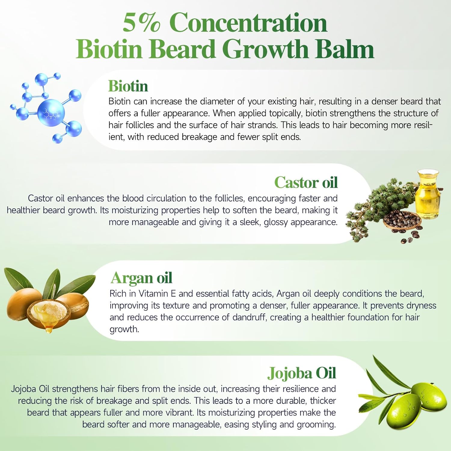 - 5% Biotin Pinnacle Concentration: Golden molecule ratio 5% of the biotin in the beard growth balm is the upper limit of the active essence - the highest effective concentration verified by the laboratory, one point less is ineffective, one point more stimulation, aerospace-grade penetration system - nano-sized carrier precision delivery of nutrients, every drop directly to the hair follicle stem cells