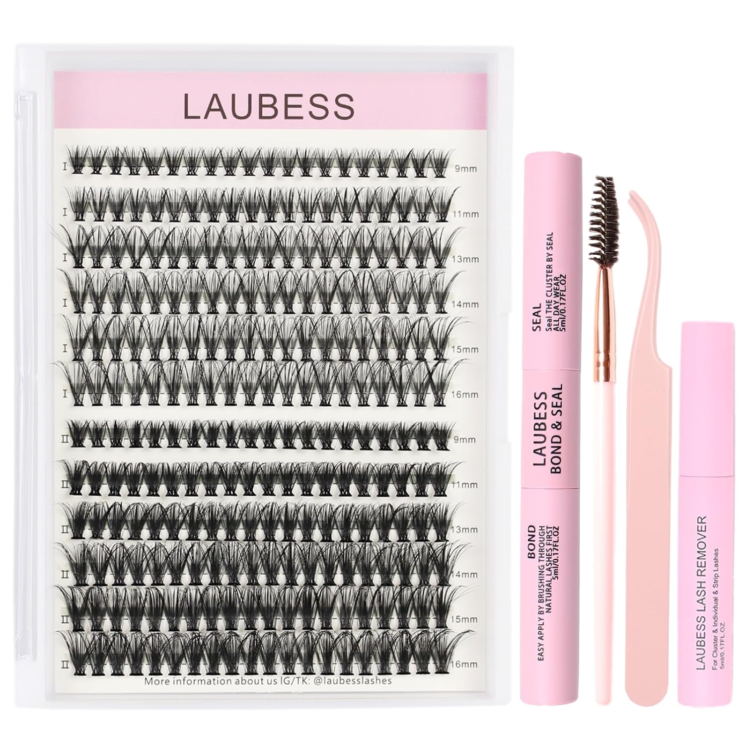 - LAUBESS Lash Clusters Kit: 1 box Lash Clusters, Lash Bond and Seal, Lash Glue Remover, LashTweezers and Brush. Everything you need is right here. You can easily apply individual lashes to diy lash extensions look with less time and money, even if newbies.
