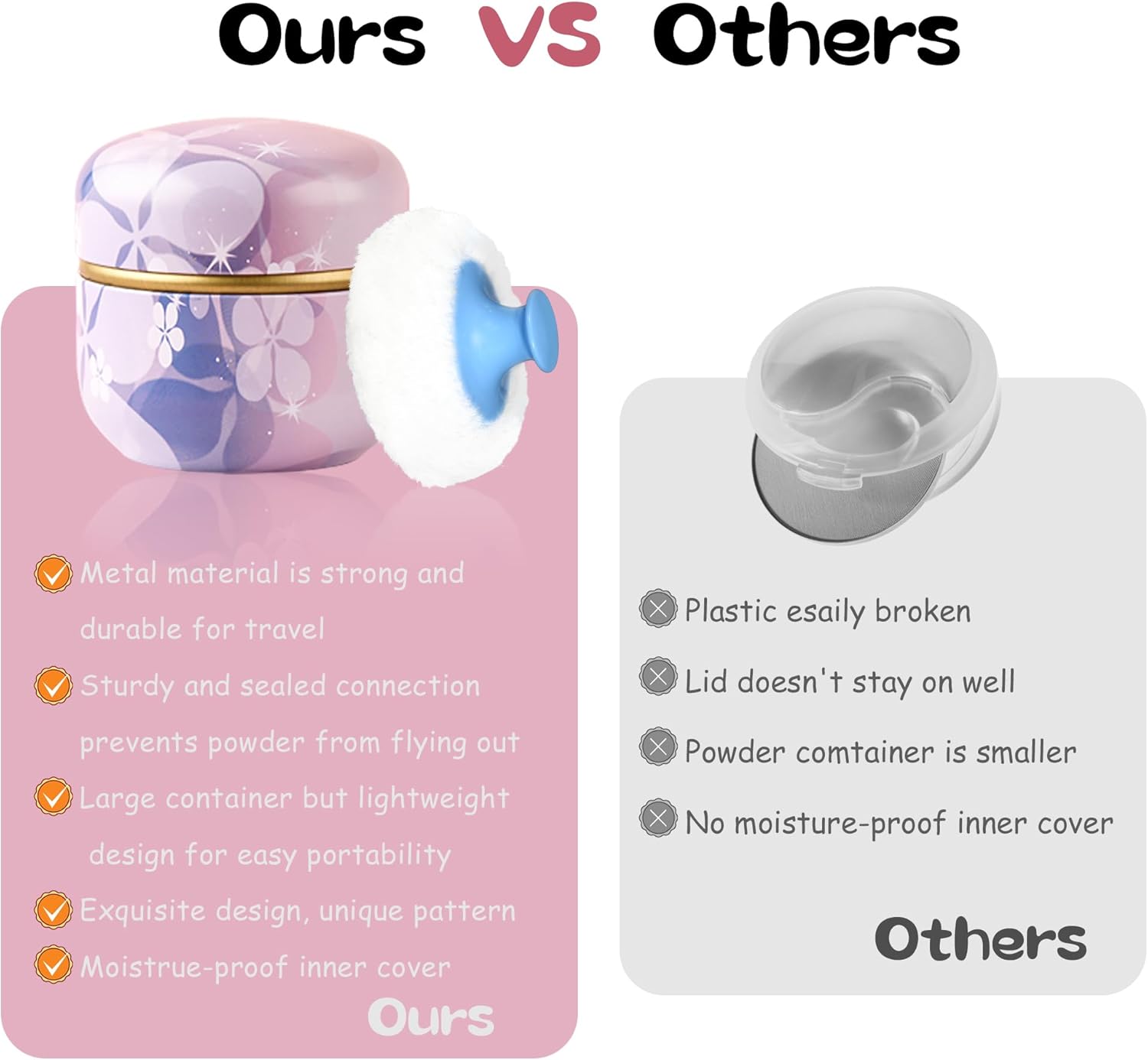 - Product contains a well-made powder case, a high quality powder puff with a handle and a small powder puff.