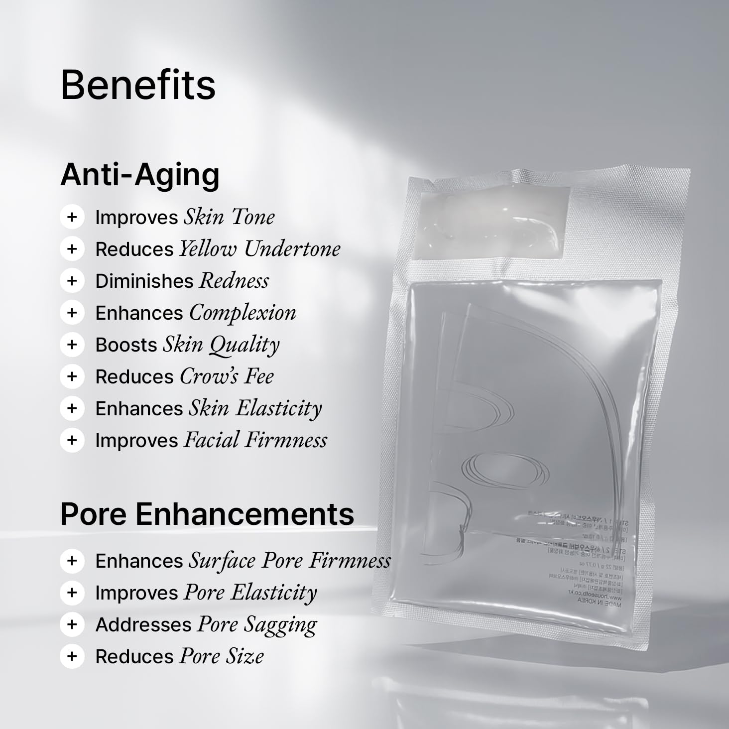 - Dual-Action Absorption Film: A two-step process combines a plumping ampoule with a patented film designed to adhere seamlessly to the face. The unique film enhances absorption, deeper hydration, and maximizes delivery of active ingredients.
