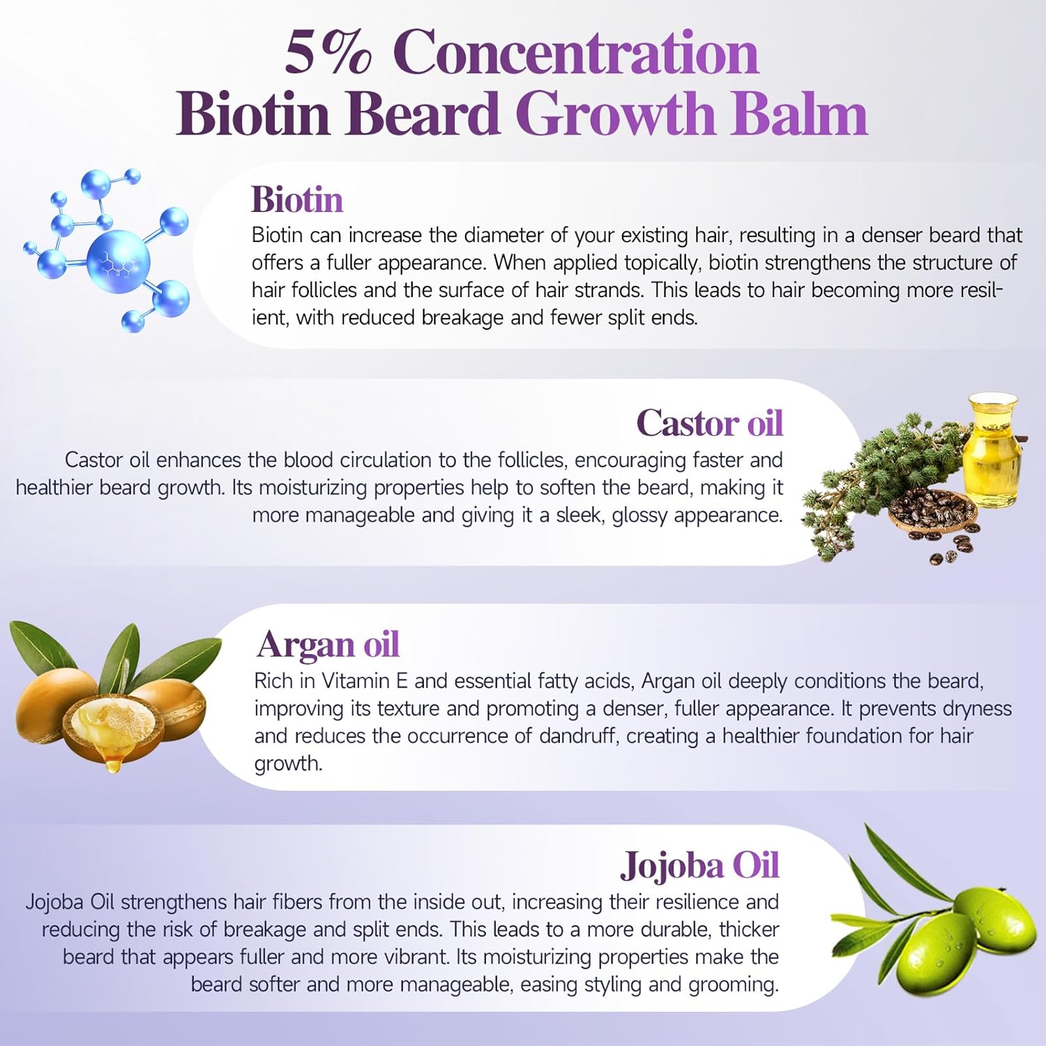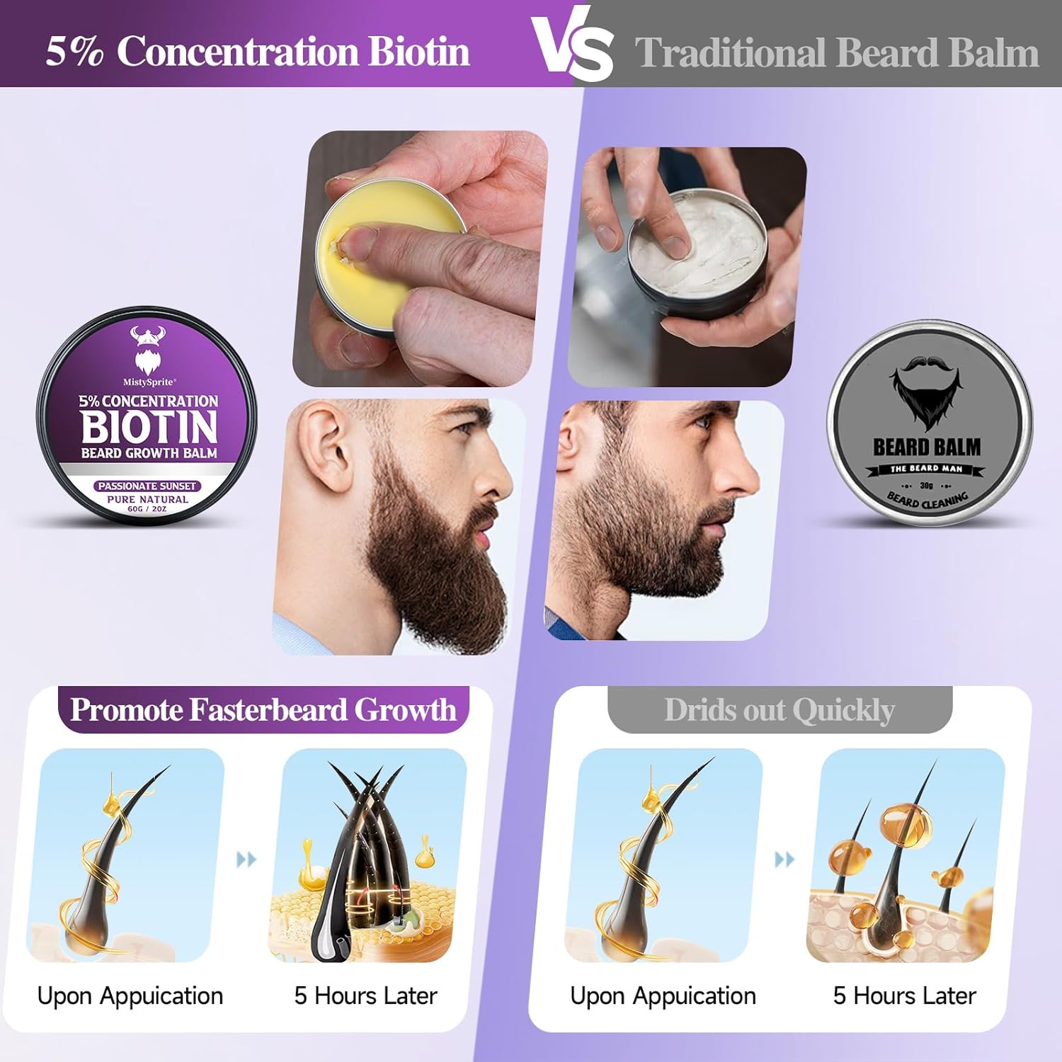 - 5% Biotin Pinnacle Concentration: Golden molecule ratio 5% of the biotin in the beard growth balm is the upper limit of the active essence - the highest effective concentration verified by the laboratory, one point less is ineffective, one point more stimulation, aerospace-grade penetration system - nano-sized carrier precision delivery of nutrients, every drop directly to the hair follicle stem cells