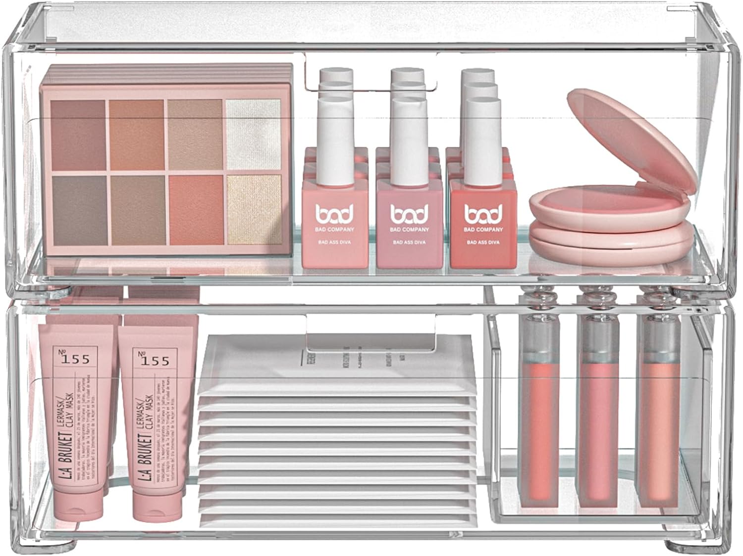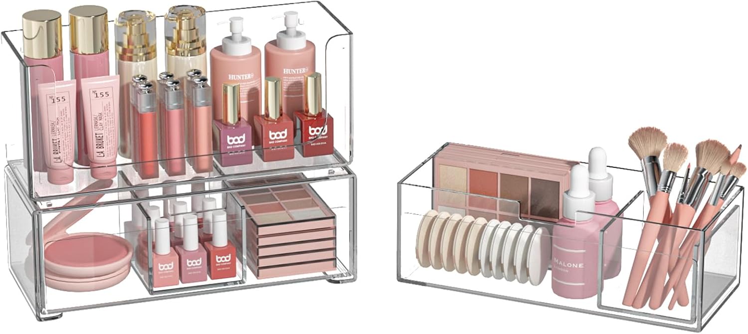 - DESKTOP ORGANIZER WITH DRAWERS: thanks to its two-in-one design, our clear organizer drawers storage box can be used as a drawer box to keep your daily essentials well organized and dustproof, or separated into two open storage holders without lids. This bathroom drawer organizer features a crystal clear body with a sleek cover for easy access and placing the items without obstruction