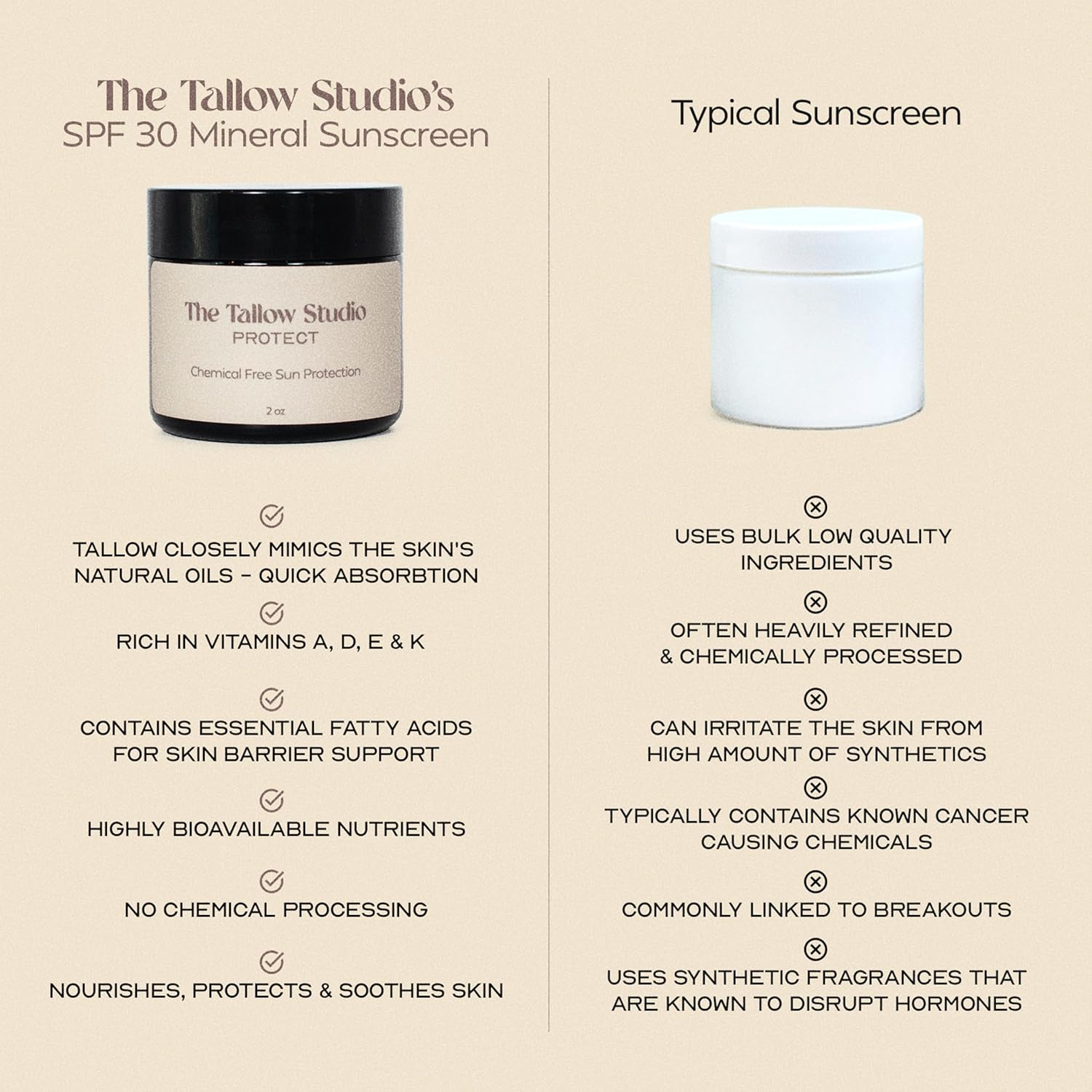 - Premium Grass-Fed Tallow for Deep Skin Nourishment Our sunscreen is crafted with 100% grass-fed, grass-finished tallow, rich in vitamins A, D, E, and K. This nutrient-dense ingredient closely mirrors the skin's natural composition, providing deep hydration and supporting skin elasticity and repair.