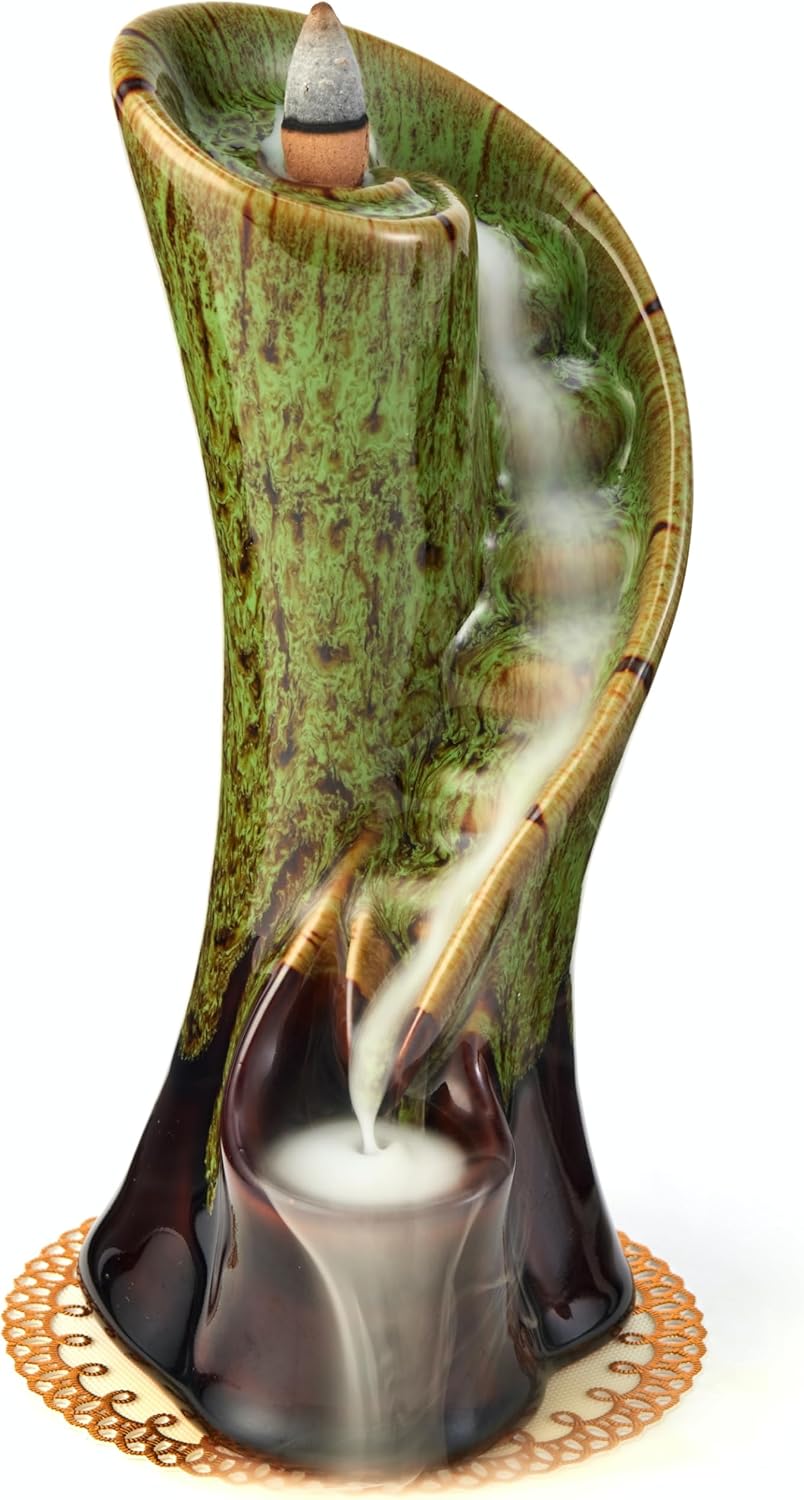 Unique Cloud Stairs Ceramic Waterfall Incense Holder, Paired with a Pack of Backflow Incense Cones. (Fambe Green)