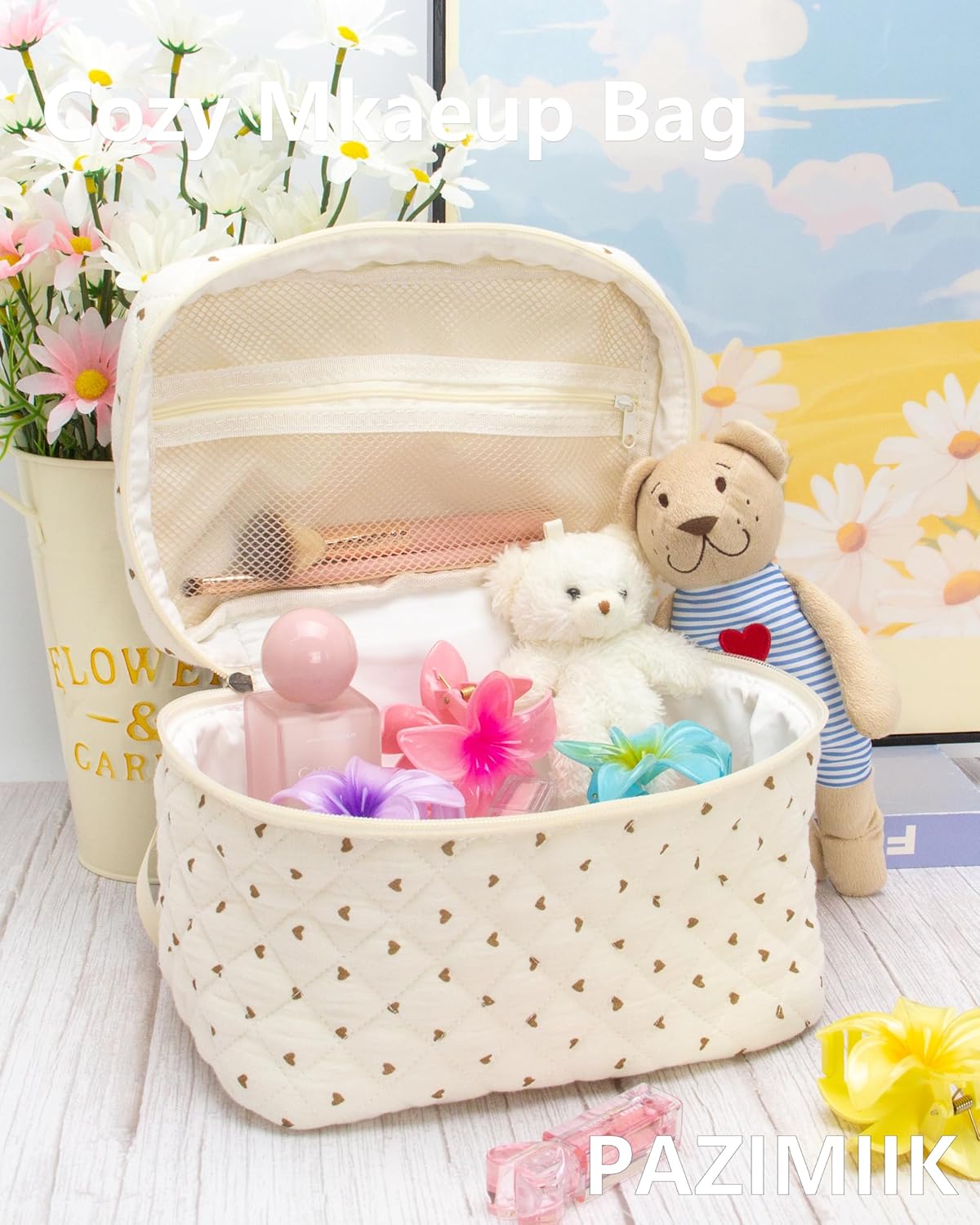PAZIMIIK 3PCS Makeup Bag SET Large Travel Quilted Zipper Soft Cosmetic Case Pouch for Women Girls Make Up,Gauze Heart Coffee