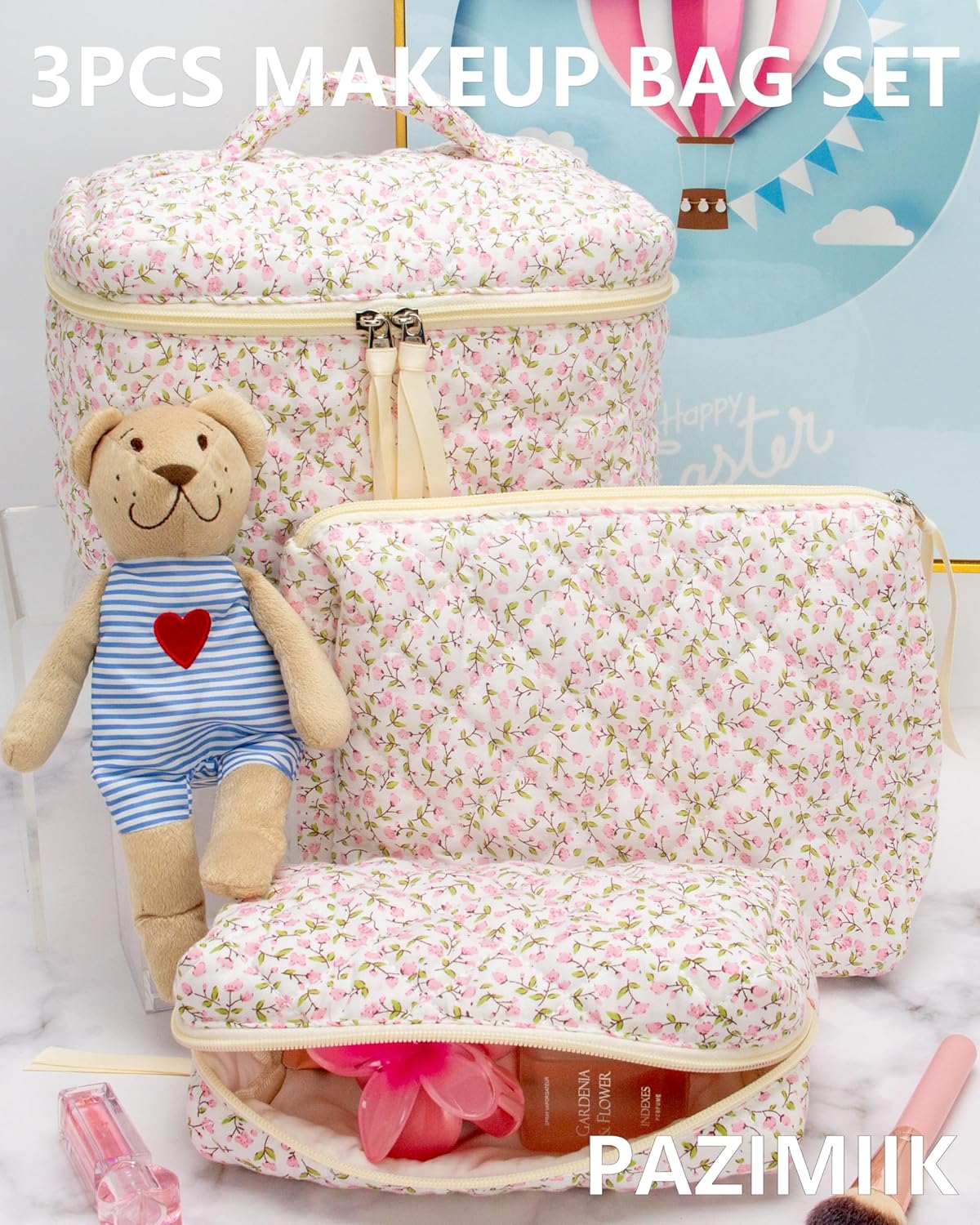 3PCS Makeup Bag SET Large Travel Quilted Zipper Soft Cosmetic Case Pouch for Women Girls Make Up,Floral Pink