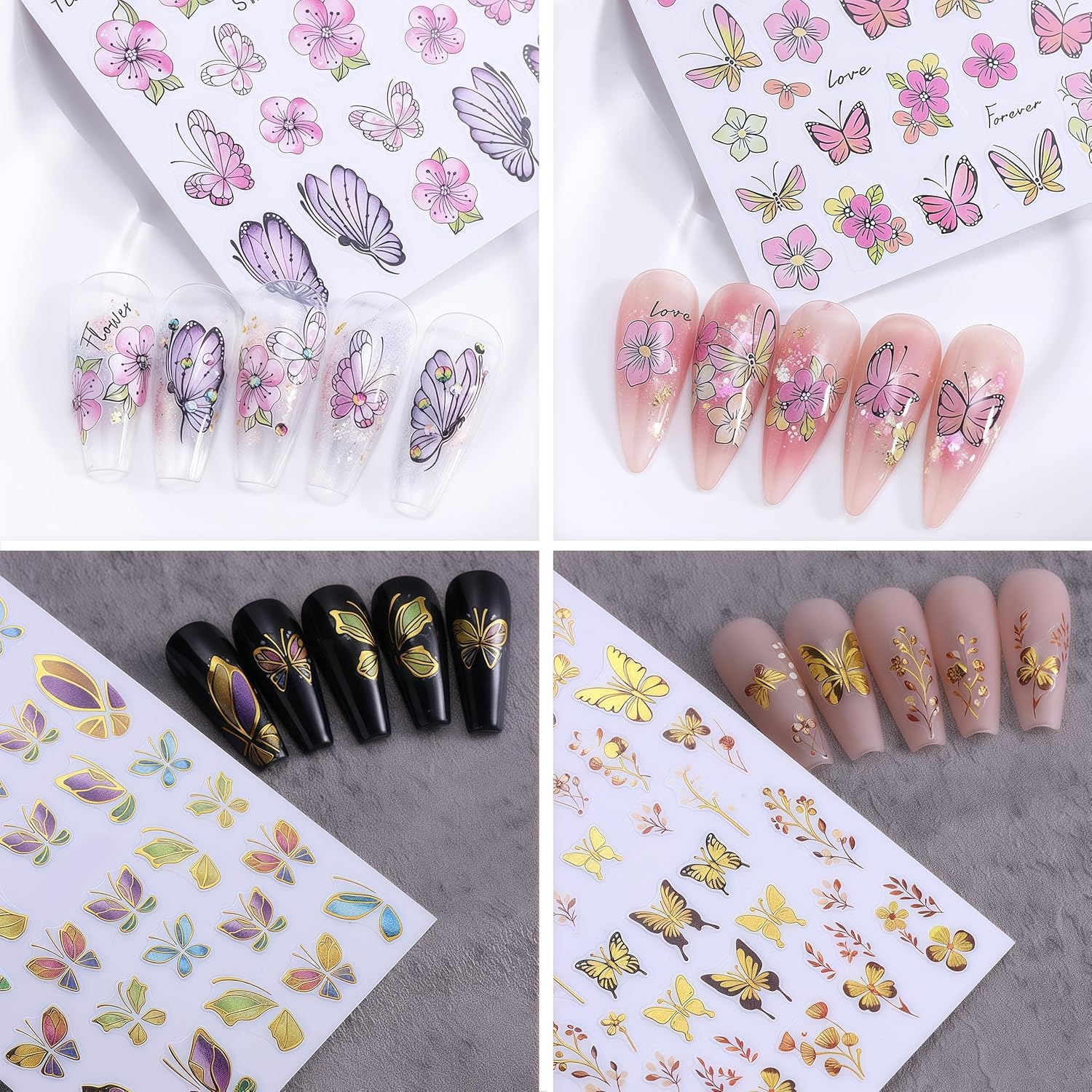 - Spring Glitter Flower Nail Stickers- You will get 8 sheets gold edge butterfly nail art stickers for acrylic nails supply, many pattern for you to choose,butterflies nail designs, and satisfy your rich imagination of nail DIY