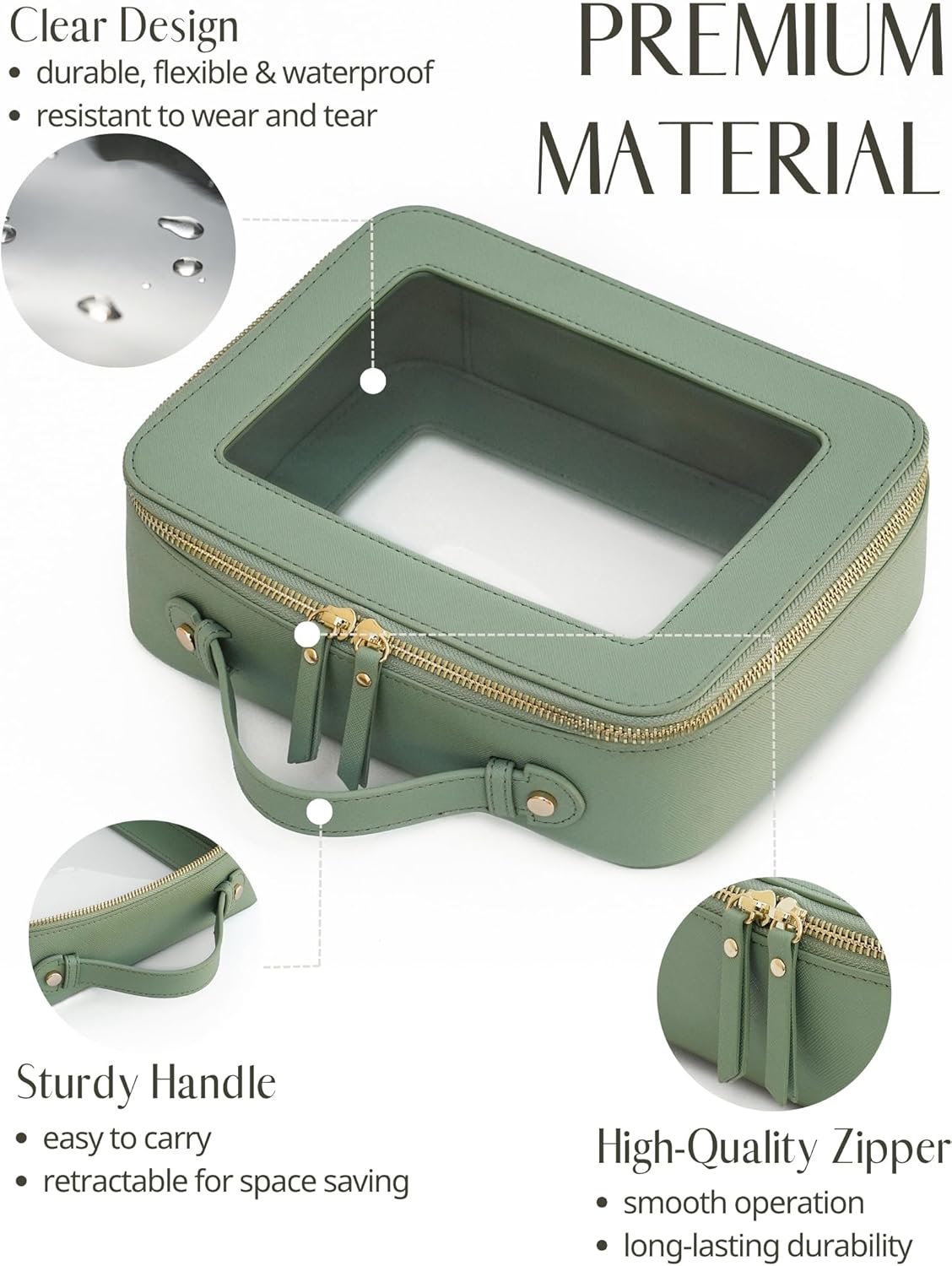 - [Premium Material and Durability] – The clear cosmetic case, both the exterior and interior, is crafted from high-grade saffiano faux leather, which is highly scratch resistant, durable and exceptionally easy to keep clean. It features a smooth zipper for secure closure, and elegant light gold metal hardware accents, adding a luxurious and sophisticated touch to the bag's overall design.
