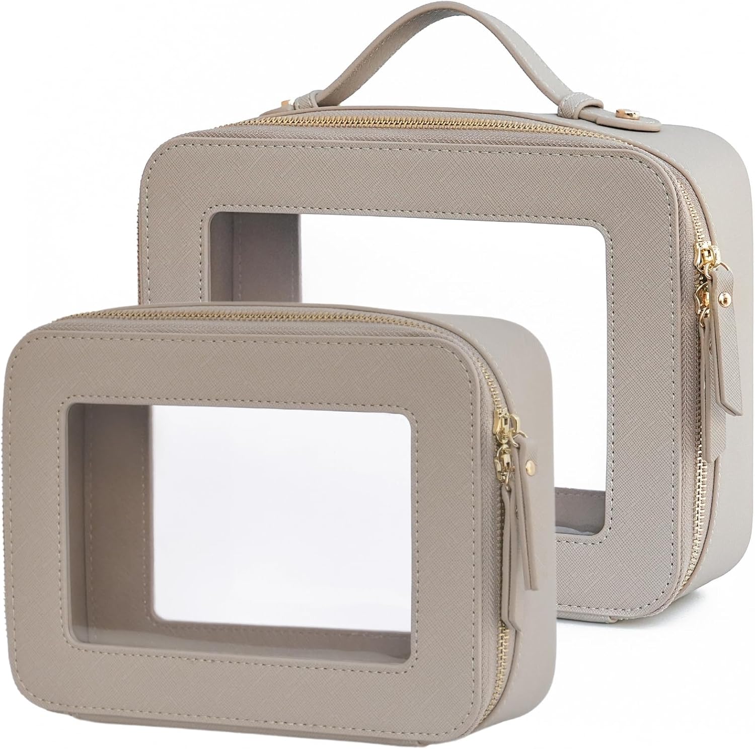 - [Premium Material and Durability] – The clear cosmetic case, both the exterior and interior, is crafted from high-grade saffiano faux leather, which is highly scratch resistant, durable and exceptionally easy to keep clean. It features a smooth zipper for secure closure, and elegant light gold metal hardware accents, adding a luxurious and sophisticated touch to the bag's overall design.