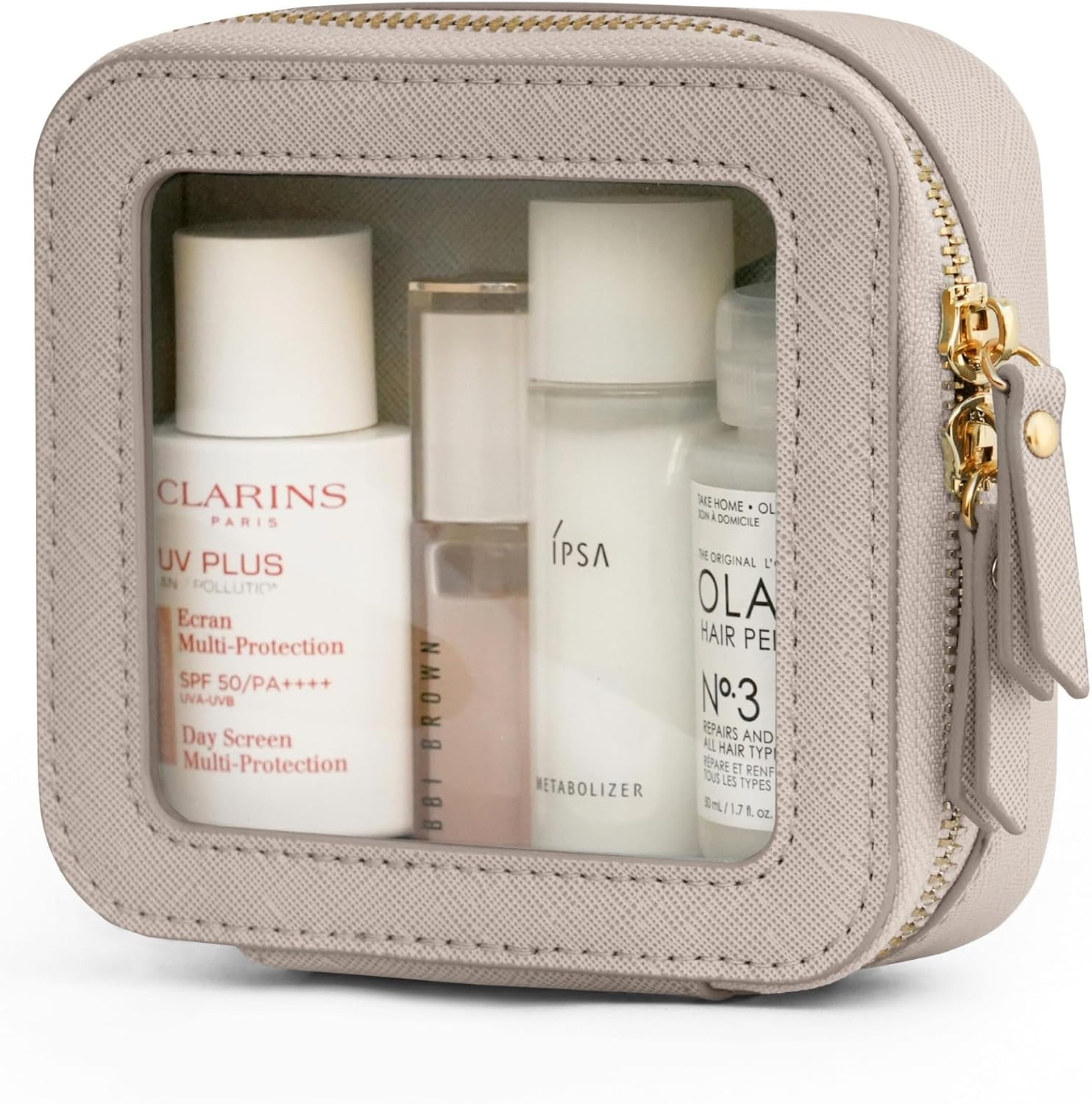 - [Premium Material and Durability] – The clear small cosmetic case, both the exterior and interior, is crafted from high-grade saffiano faux leather, which is highly scratch resistant, durable and exceptionally easy to keep clean. It features a smooth zipper for secure closure, and elegant light gold metal hardware accents, adding a luxurious and sophisticated touch to the bag's overall design.