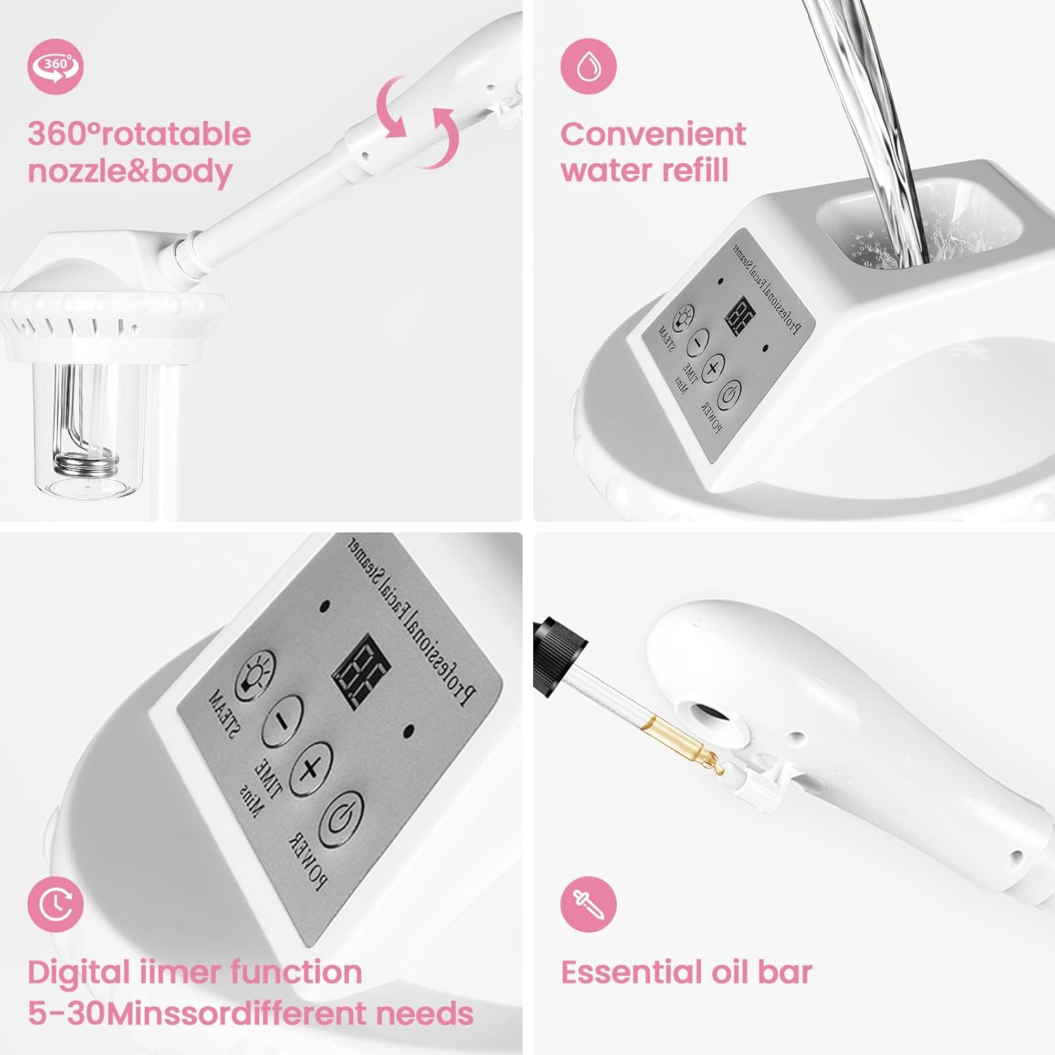 - 【Adjustable Height】–The height of this professional facial steamer can be adjusted from 36 inches to 51 inches, with a 360-degree rotating main frame and a 360-degree rotating nozzle, which is very suitable for spa or home personal care.