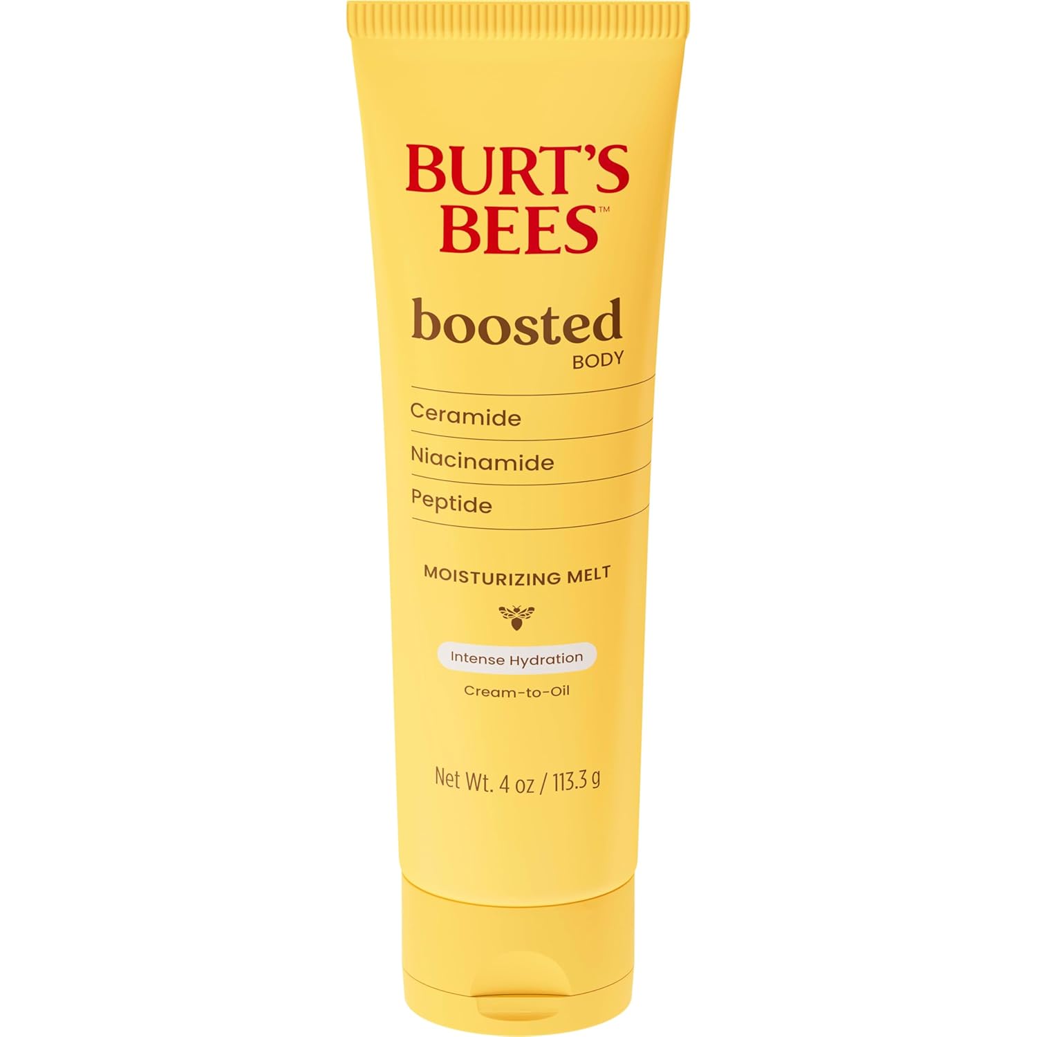 Burt's Bees Boosted Body Moisturizing Melt With a Ceramide, Niacinamide and Peptide Complex, Intense Skin Hydration, Cream-to-Oil Body Lotion Helps Support Skin Barrier, Tropical Scented, 4 oz. Tube