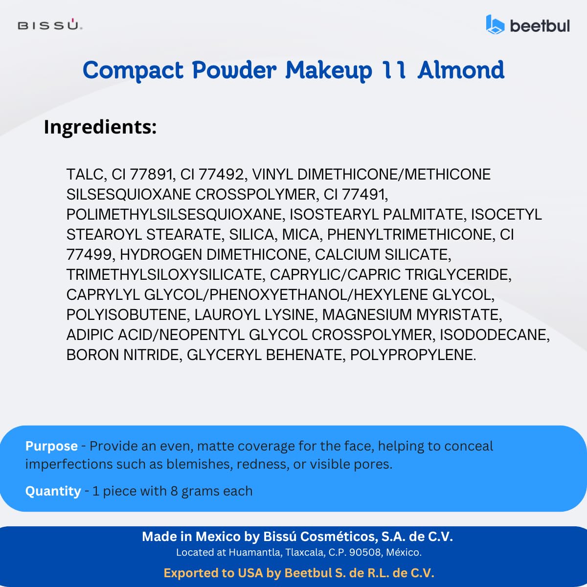 - Bissú Compact Powder (original) – Authentic Mexican makeup with a smooth matte finish. Great for touch-ups or full coverage. Suits all skin types and tones.
