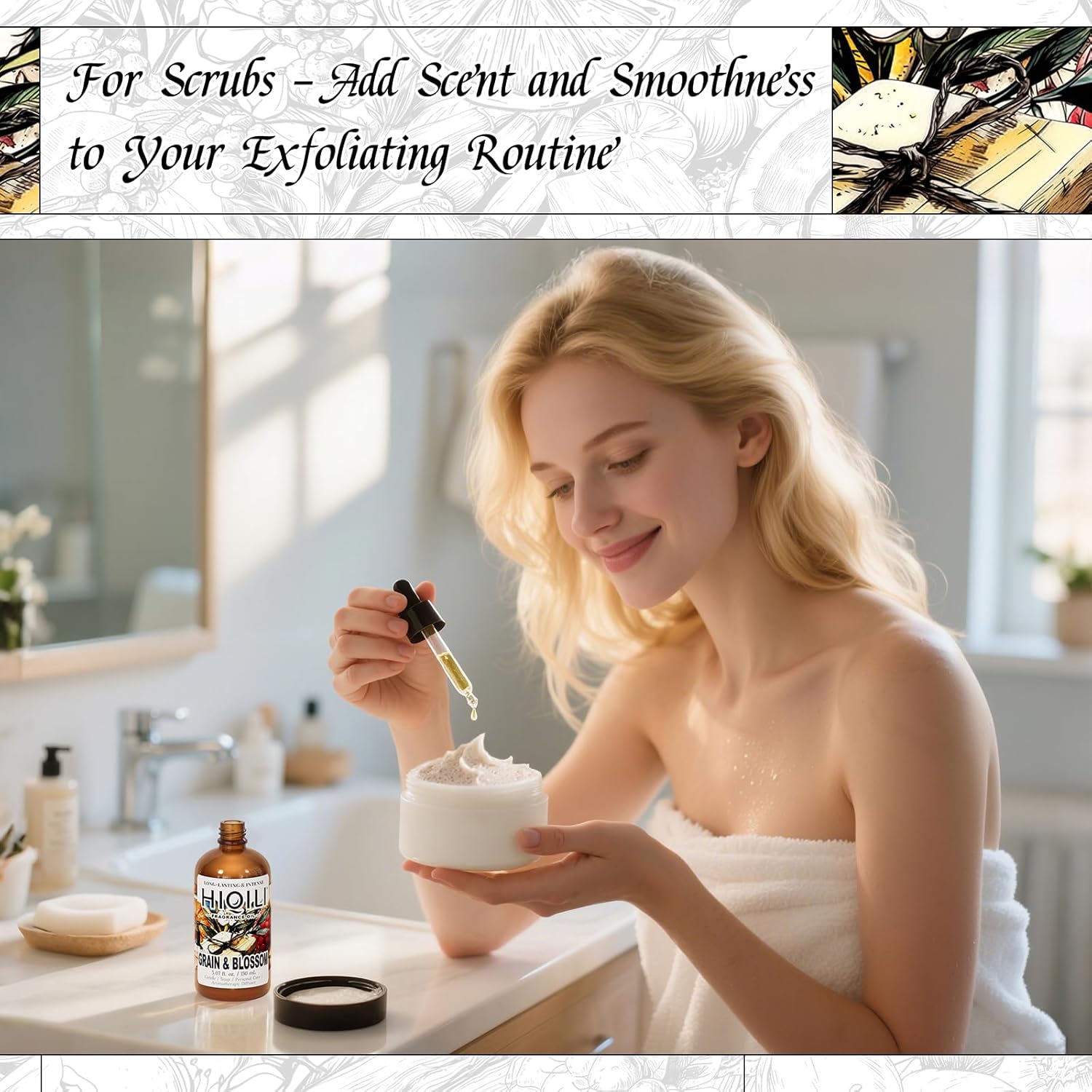 HIQILI Grain & Blossom Fragrance Oil for Diffuser, Candle, Solid Perfume Making, Fresh Floral Scents, Body & Skin Care - 5.07 Fl Oz