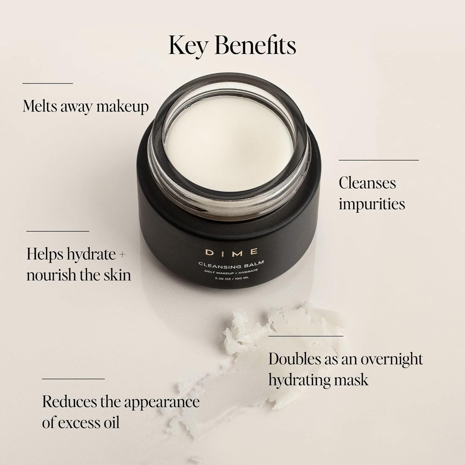 - DOUBLE CLEANSE: Double cleansing is a crucial aspect of having clear, healthy skin. First, use our Cleansing Balm to remove makeup and surface-level impurities. Next, use your favorite DIME cleanser.
