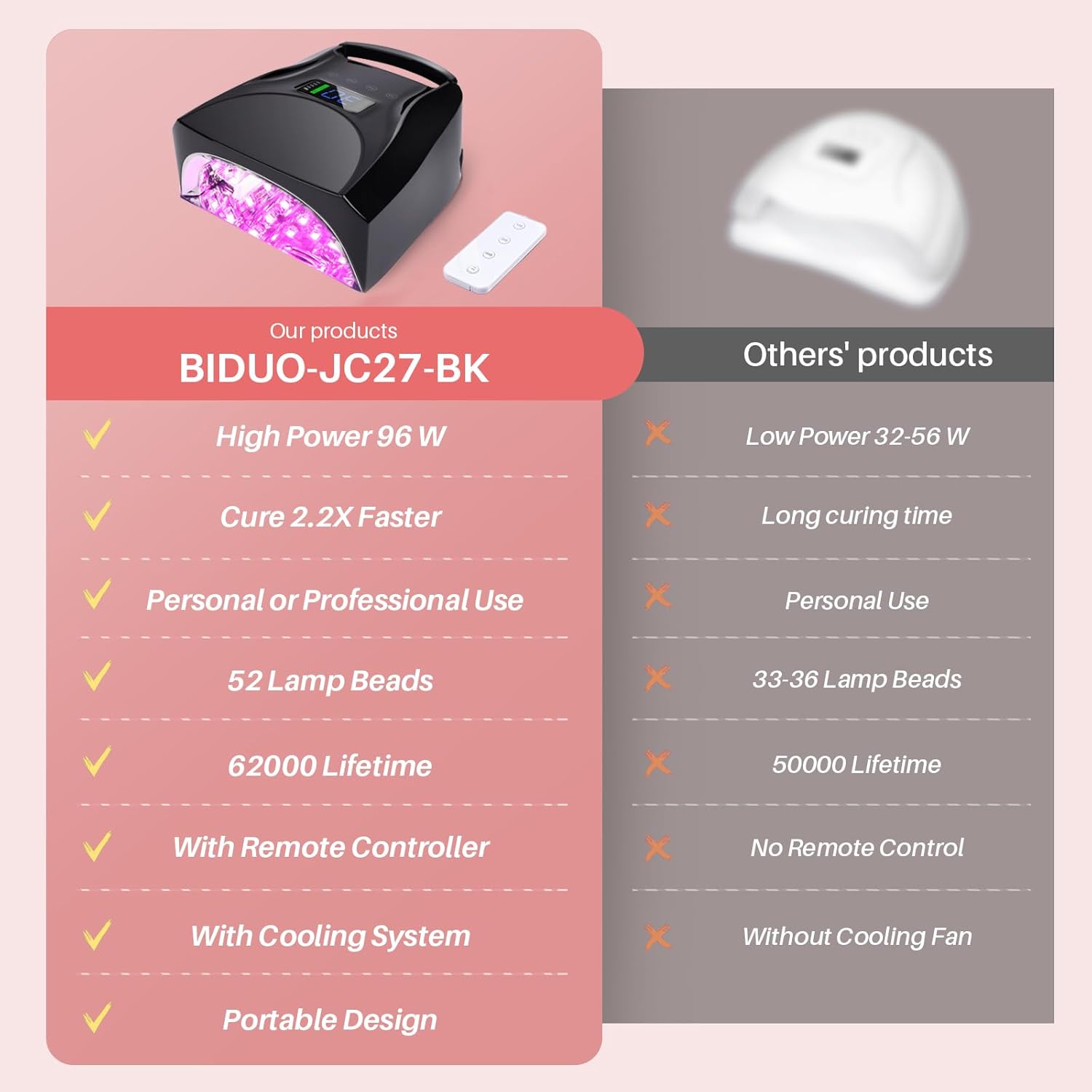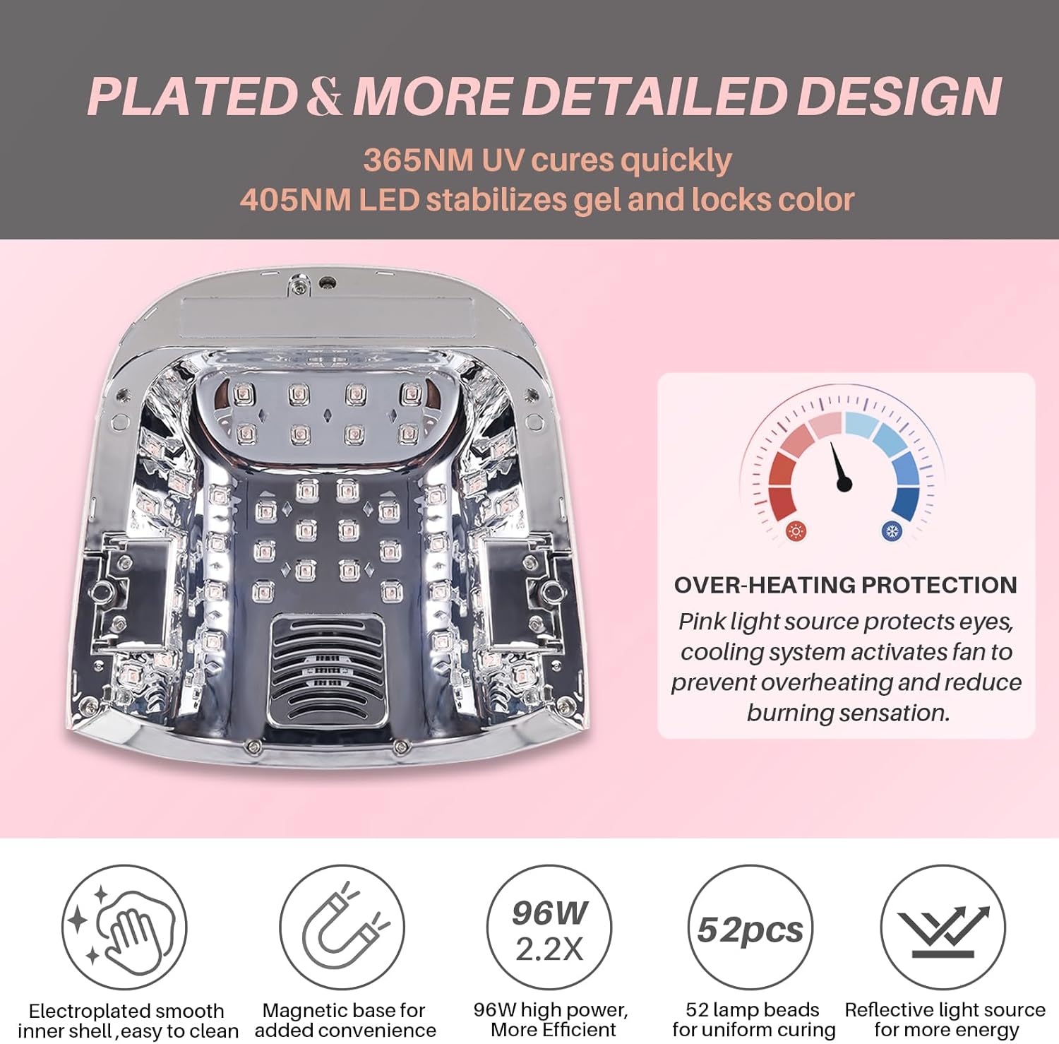 - 【DUAL LIGHT SOURCE & 52 BEADS】: 52 LEDs Using advanced UV LED double light source bulb technology(365nm+405nm) to cure all kinds of nail gel; 96 watts of power offers 90% faster curing speeds than lower wattage UV nail lamp.