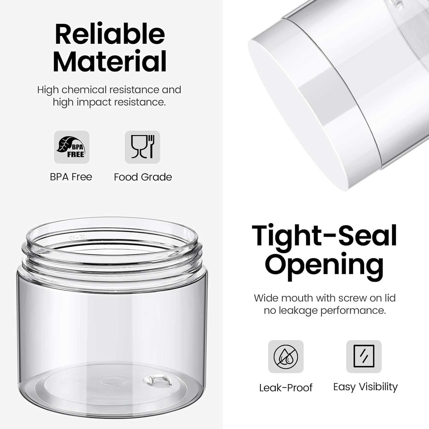 - Proper Size: 6 fl. oz empty containers measures Diameter 2.79 inches/ 7.1 cm, Height 2.48 inches / 6.3cm, wide mouth design make it easy to refill and clean; These containers will fit perfectly in your handbag for travel, stored or displayed on a shelf, Perfect for promotional goods and item re-sale, these containers are neatly elegant and attractive.