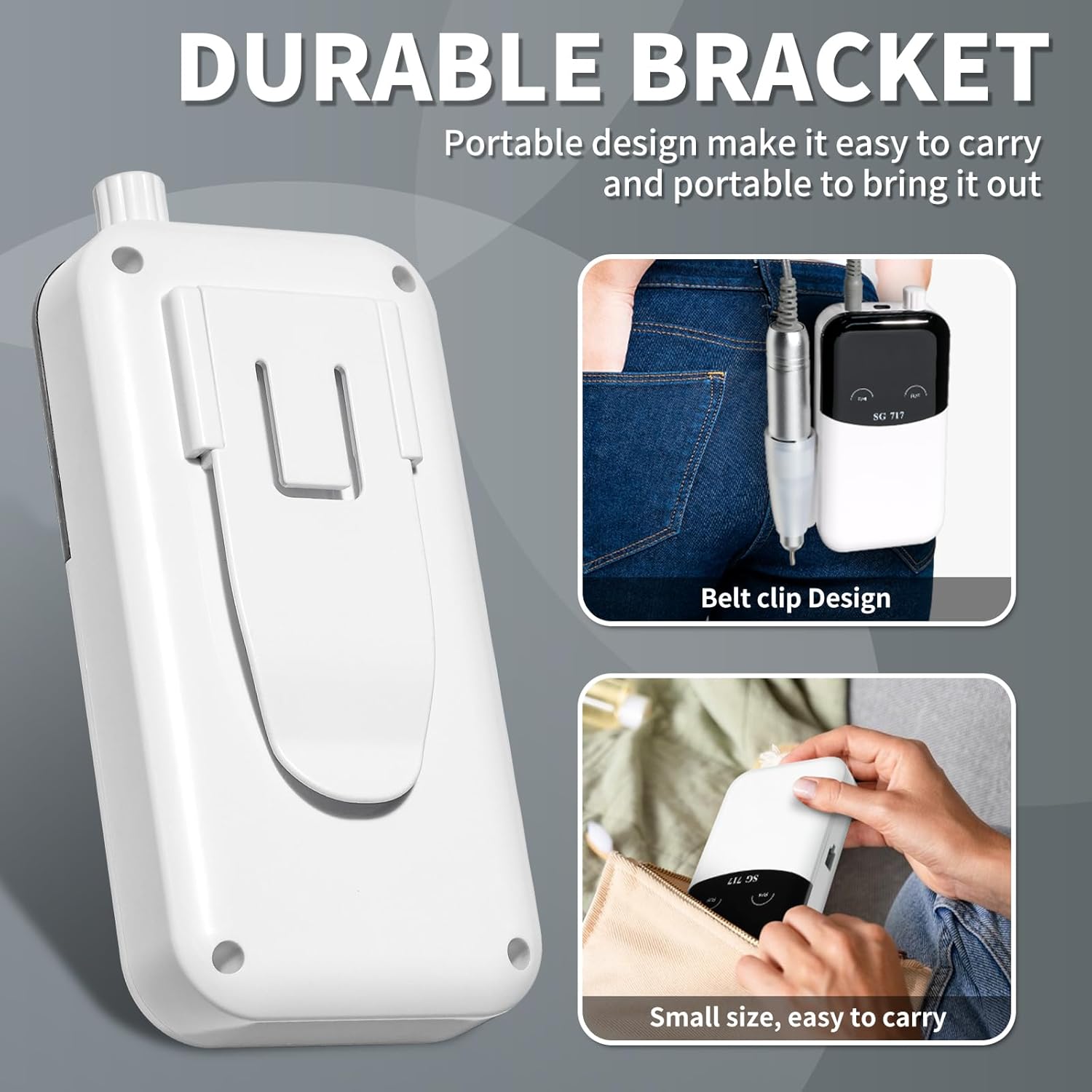 - 【Portable Nail Drill】This electric nail drill come with a portable Hanging clip design design make it Can be clipped around the waist of pants for use,compact to pack into your bag for carry and enjoy the nail art DIY anywhere anytime.Portable base design, when not using electric nail drill, can be placed on the base for upright and atmospheric display.