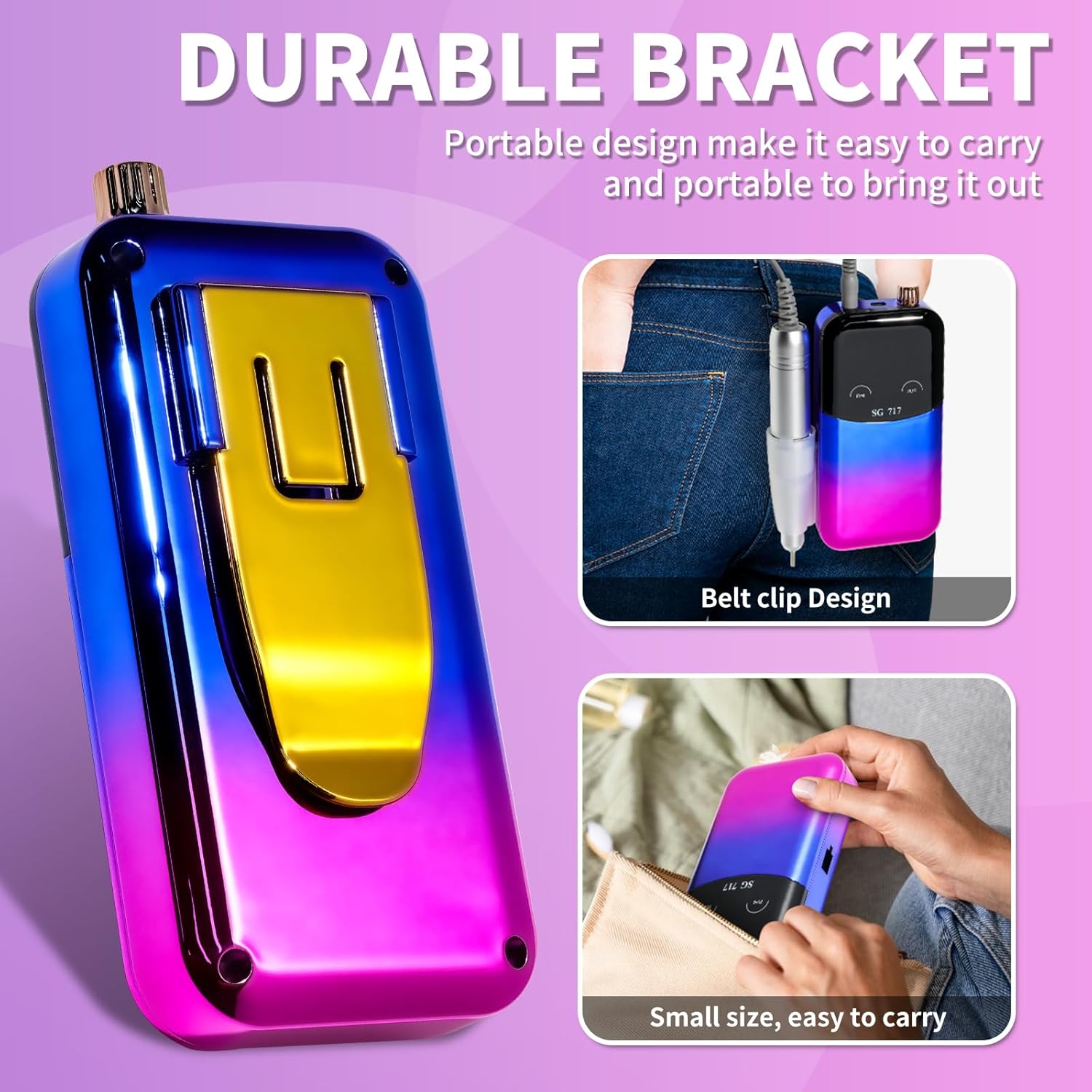- 【Portable Nail Drill】This electric nail drill come with a portable Hanging clip design design make it Can be clipped around the waist of pants for use,compact to pack into your bag for carry and enjoy the nail art DIY anywhere anytime.Portable base design, when not using electric nail drill, can be placed on the base for upright and atmospheric display.
