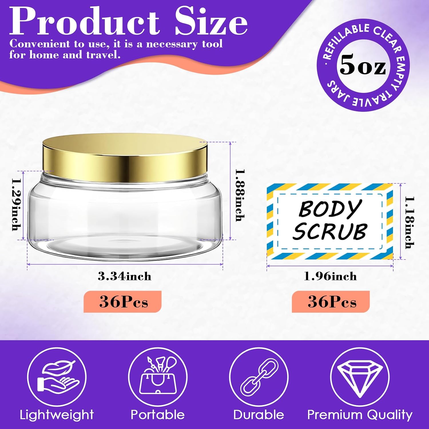 36 Pack 5 oz Plastic Cosmetic Containers With Lids Refillable Clear Empty Travle Jars Containers for Body Butter,Sugar Scrubs,Cream,Lotions,Candy, Waterproof Label&Spatulas - (Clear Lid)