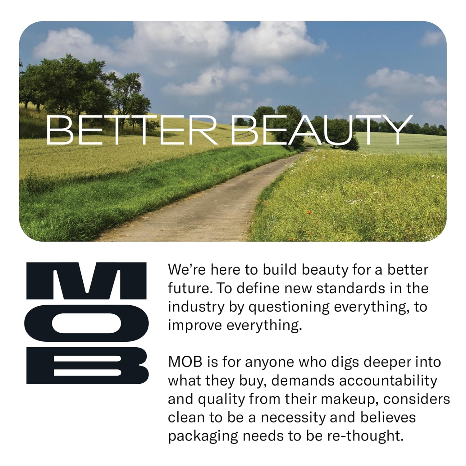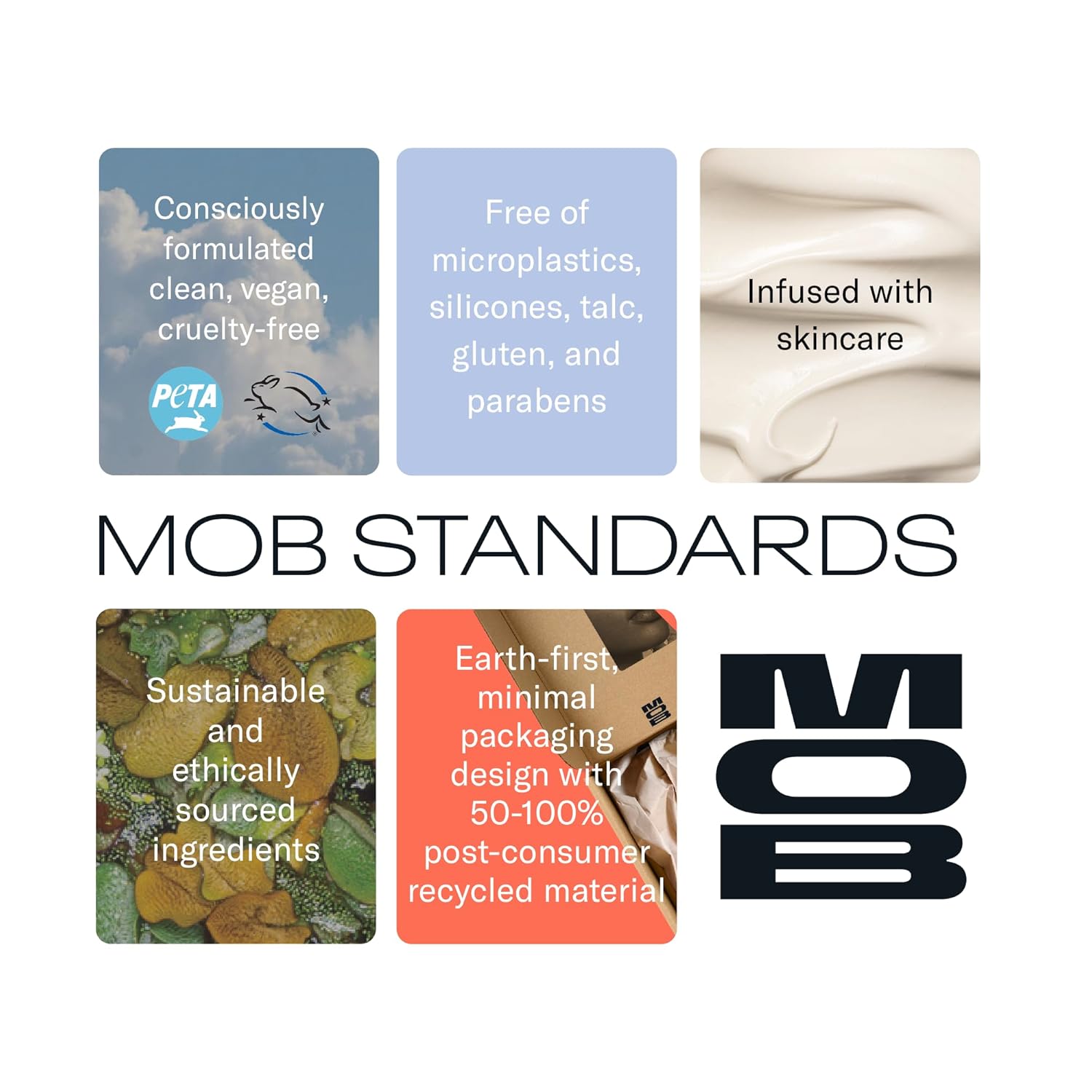 - Consciously Formulated Clean, Cruelty-Free, & Vegan – At MOB, we formulate with an extensive "free from" list including parabens, petroleum-based ingredients, silicones, gluten, talc, & microplastics. All our ingredients are ethically and sustainably sourced and certified PETA Vegan and Leaping Bunny Cruelty-free, never containing animal ingredients such as beeswax or carmine
