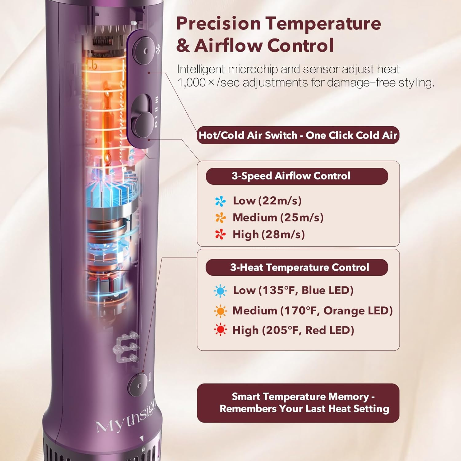 - 3 Heat / 3 Speed + One-Touch Cool Shot — 3-Heat temperature control: low 135°F (Blue LED), medium 170°F (Orange LED), high 205°F (Red LED). 3-Speed airflow control: Low / Medium / High. Dial in the perfect combo for your hair type, then press the Cool Shot button once (press-to-toggle; no need to hold) and wait 10s to lock styles with less heat damage.