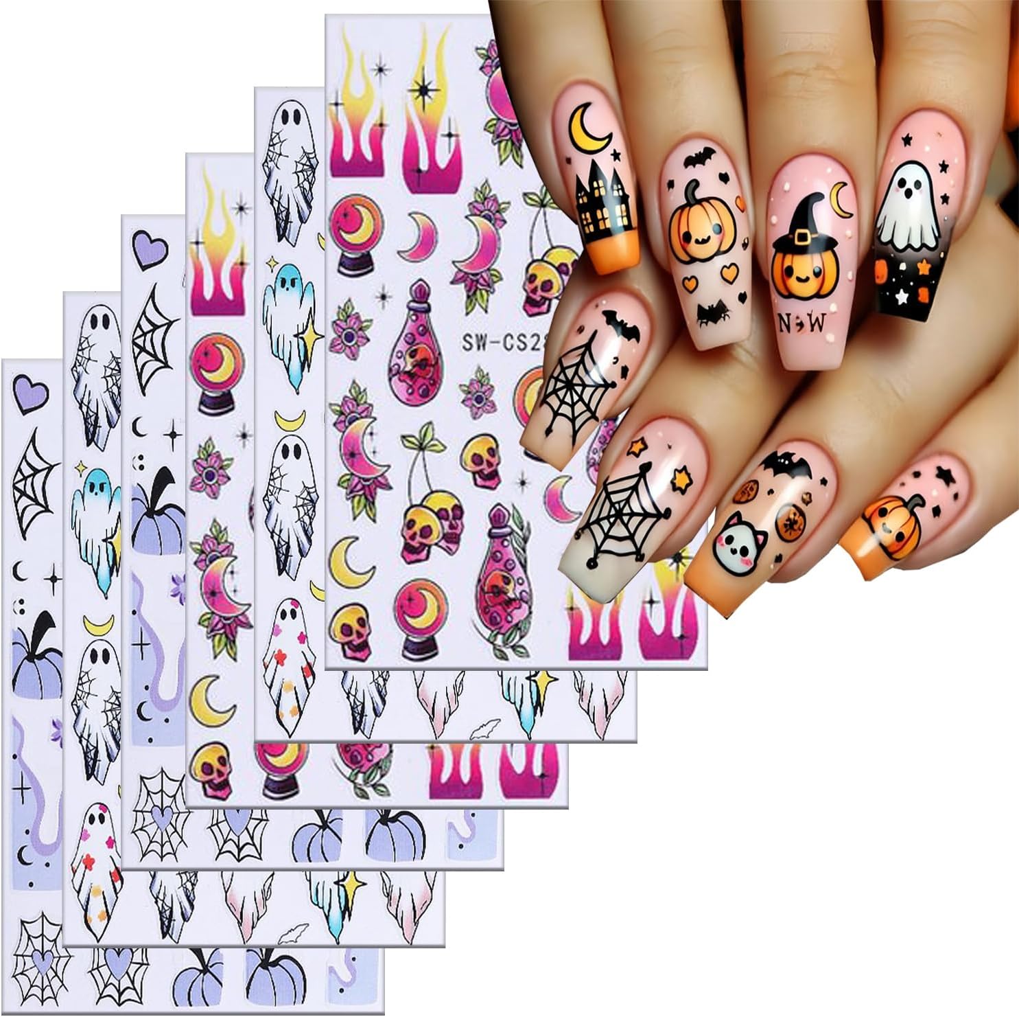 - Quantity:You will get 6 sheets 3D self -adhesive Hallowen nail art adhesive stickers, Each stickers size about 3.77x 2.55 inches(9.6x6.5cm). Cute ghost, heart spider web, bat, flame, bat, skull etc patterns design for your choice, these nail stickers are perfect for matching other nail art