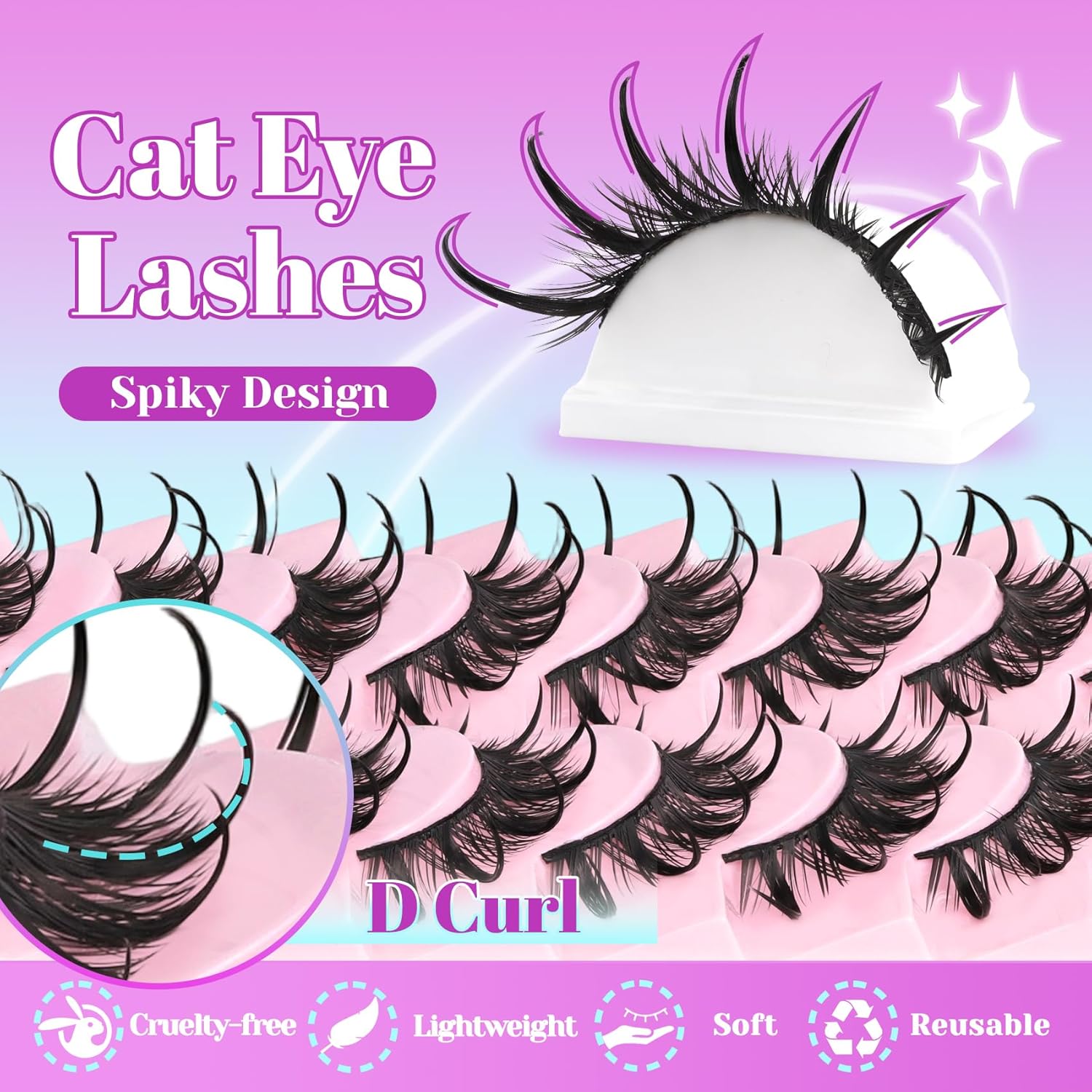 - Wet Look Cat Eye Lashes: These false eyelashes are wet look, D curl and cat eye style. 100% handmade created the just right length and volume, and the spiky tips are made by the new technology of brushing glue. So the spikes are a little hard because of brushing some glue to stay the unique curl and spiky effect.