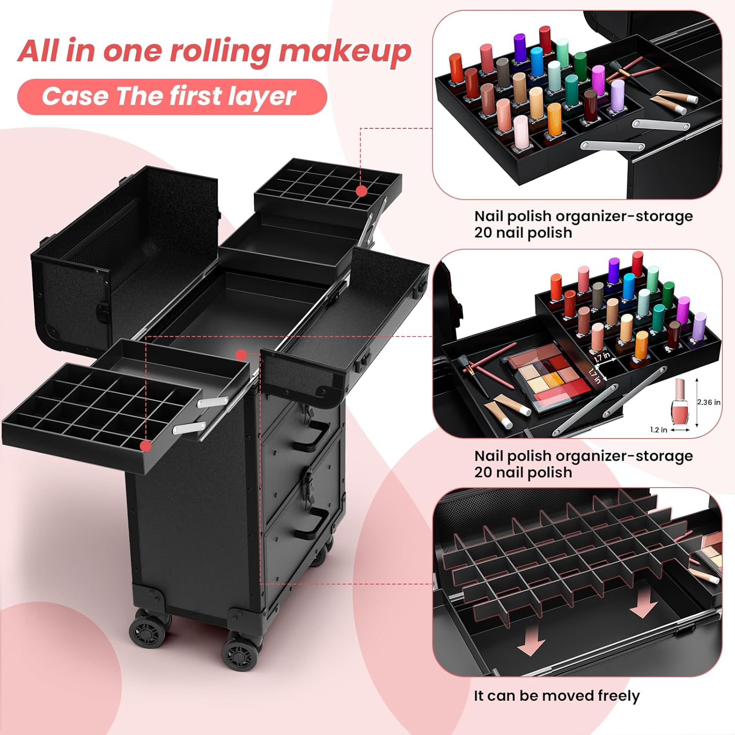 - Fully Adjustable Compartments : The rolling makeup case includes a top layer with polish racks & dividers (secures 45 bottles upright; dividers removable for bulk items), a built-in brush pouch in the lid for cosmetics, and two large slide-out drawers for flat irons, curlers, sprays, or palettes.