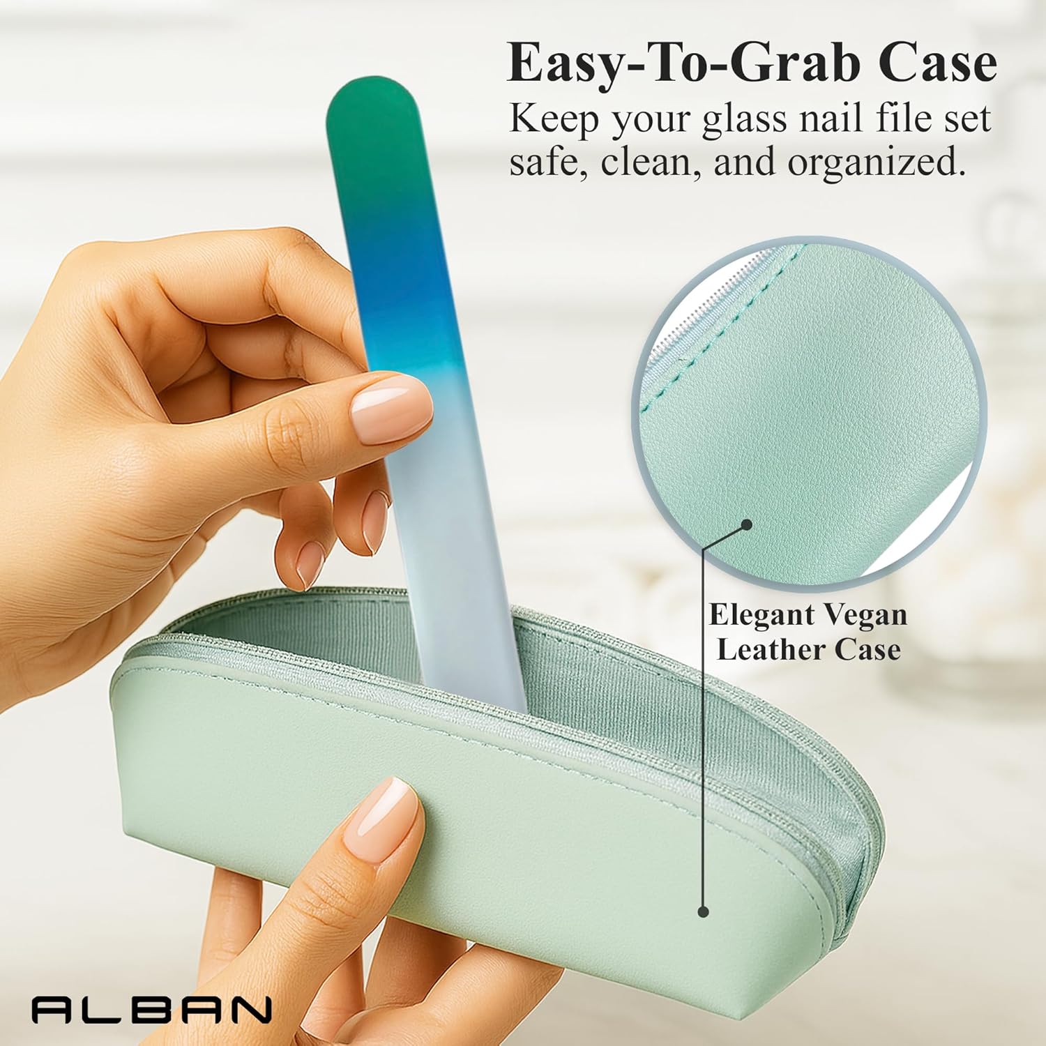 Alban Czech Glass Nail File Set with Manicure Stick & Vegan Leather Cosmetic Case (Green-Blue Nail Files, Green Manicure Stick & Light Blue Cosmetic Case)